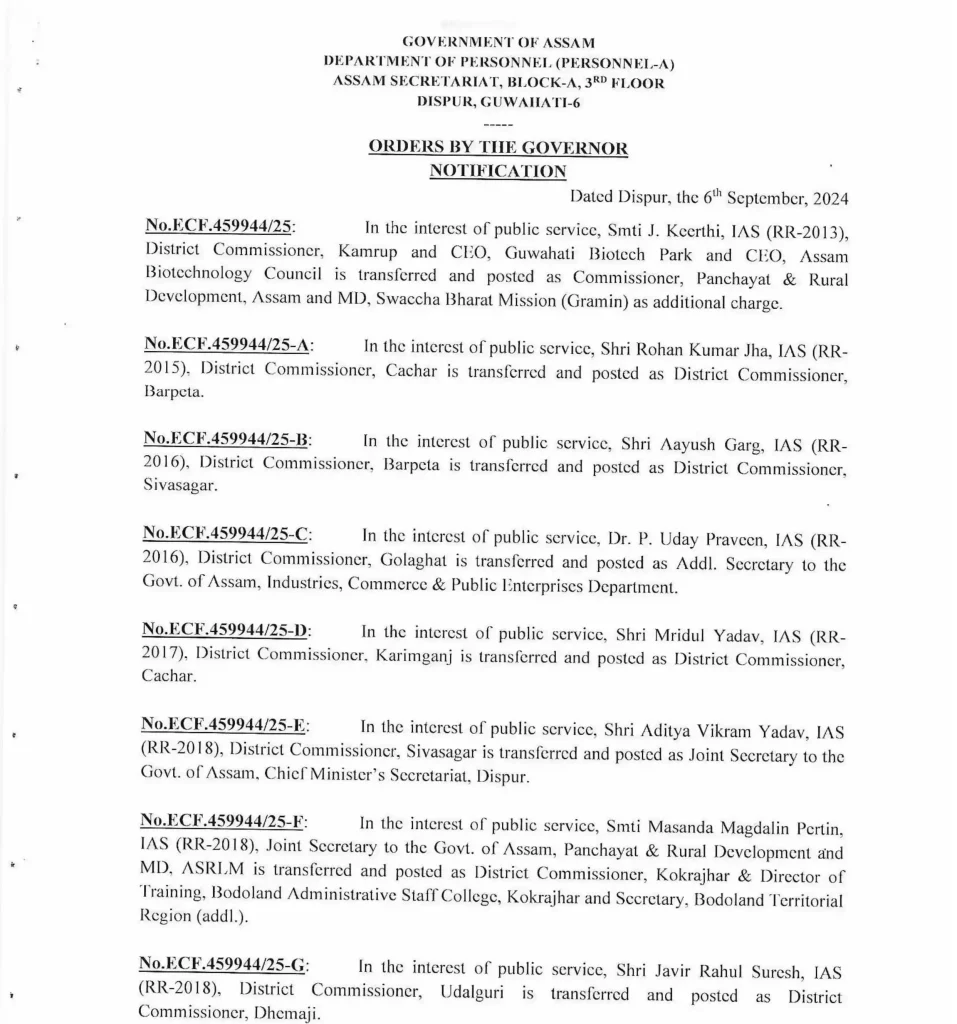 Guwahati, September 6, 2024: In a significant move aimed at optimizing public service delivery, the Government of Assam, under the directive of the Governor, has announced a wide-ranging reshuffle of District Commissioners across the state. The Department of Personnel (Personnel-A), Assam Secretariat, issued the official notification today, detailing the new appointments and transfers.