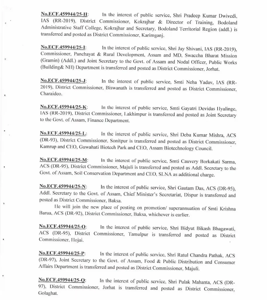 25. Shri Pallab Mazumdar, ACS (DR-02): District Development Commissioner, Dhubri, has been reassigned as Joint Secretary to the Government of Assam, Chief Minister’s Secretariat, Dispur.